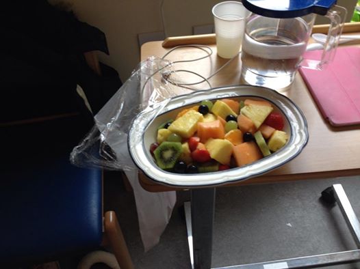 Right my dilemma tonight guys is, I am having a blood transfusion and felt very uncomfortable so decided to take my bra off!! But obviously as the line is in my arm I can’t get the bra away, so this is where it’s ended up!!! Also have dropped all my popcorn over the floor, so now a sticky mess, am wondering why the nurses have shut my door!!!